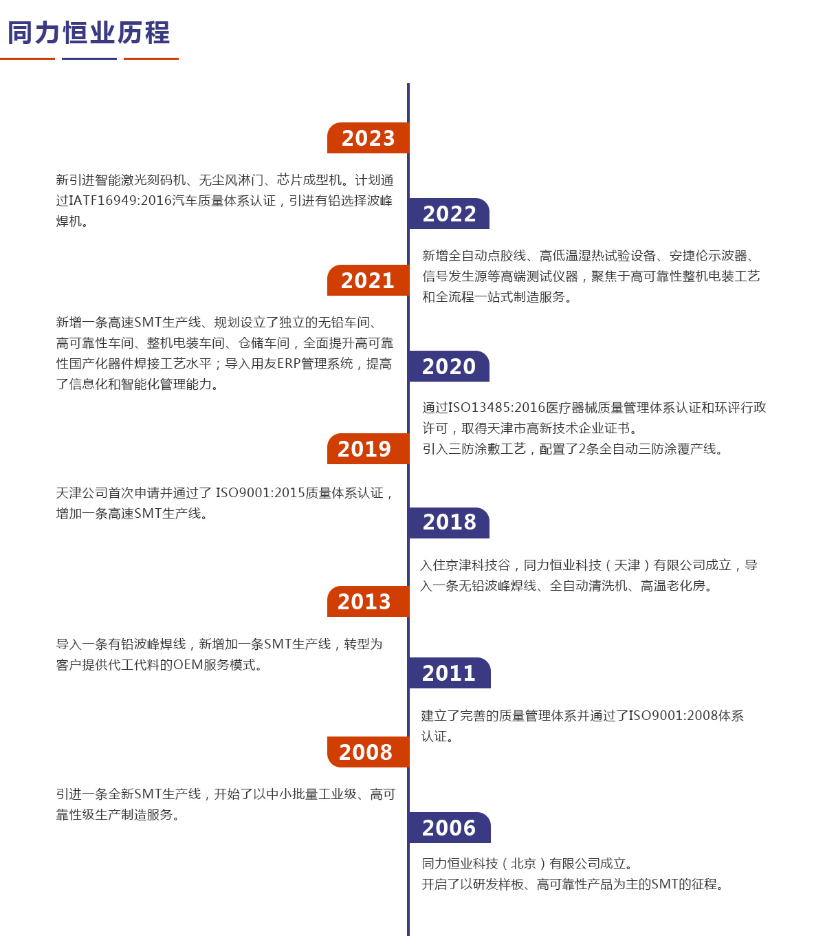 同力恒業科技成立于2006年,專業從事電子制造服務(EMS),專注于為客戶提供產品開發(fā)、工藝設計、物料配套、精密貼裝、插件焊接、三防涂敷、整機電裝、測試老化以及包裝運輸、售后維修等整個供應鏈解決方案。公司定位于高可靠性及中高端產品電子制造服務,在通訊導航、儀器儀表、醫療設備、汽車電子等領域具有豐富的一站式制造服務經驗。